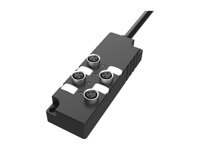 DB080403-2-03P Lanbao je kompaktní distribuční box určený pro připojení senzorů v automatizačních aplikacích. PUR kabel lépe odolává mechanickému namáhání a box zjednodušuje rozvod signálů ze 4 portů M8.