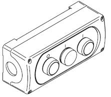 Skříňka plast 3 místa, bez aretace, 2 tlačítka se zapuštěnou hlavicí, signálka uprostřed - levé: 1 rozpínací kontakt, barva: červená, popis: O, uprostřed: 1 blok žárovek, barva: čirá, popis: I, pravé: 1 spínací kontakt, barva: zelená, popis: I