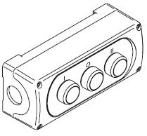 Skříňka plast 3 místa, bez aretace, 3 tlačítka se zapuštěnou hlavicí - levé: 1 spínací kontakt, barva: zelená, popis: I, uprostřed: 1 rozpínací kontakt, barva: červená, popis: O, pravé: 1 spínací kontakt, barva: zelená, popis: II