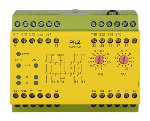 Bezpečnostní relé (standalone), vstupy: 1/2-kanálové zapojení s/bez identifikace příčného zkratu, výstupy: 3 spínací kontakty, 1rozpínací kontakt, 2 zpožděný spínací kontakt, automatický/ruční start, UB 24 V DC, šířka: 112,5 mm, šroubovací svorky integrované, monitorování nouzového zastavení,ochranných dveří, se dvěma nezávisle nastavitelnými kontakty se zpožděným odpadnutím, doba odpadnutí 12 úrovní z 1 - 20 s/0,1 - 3 s.