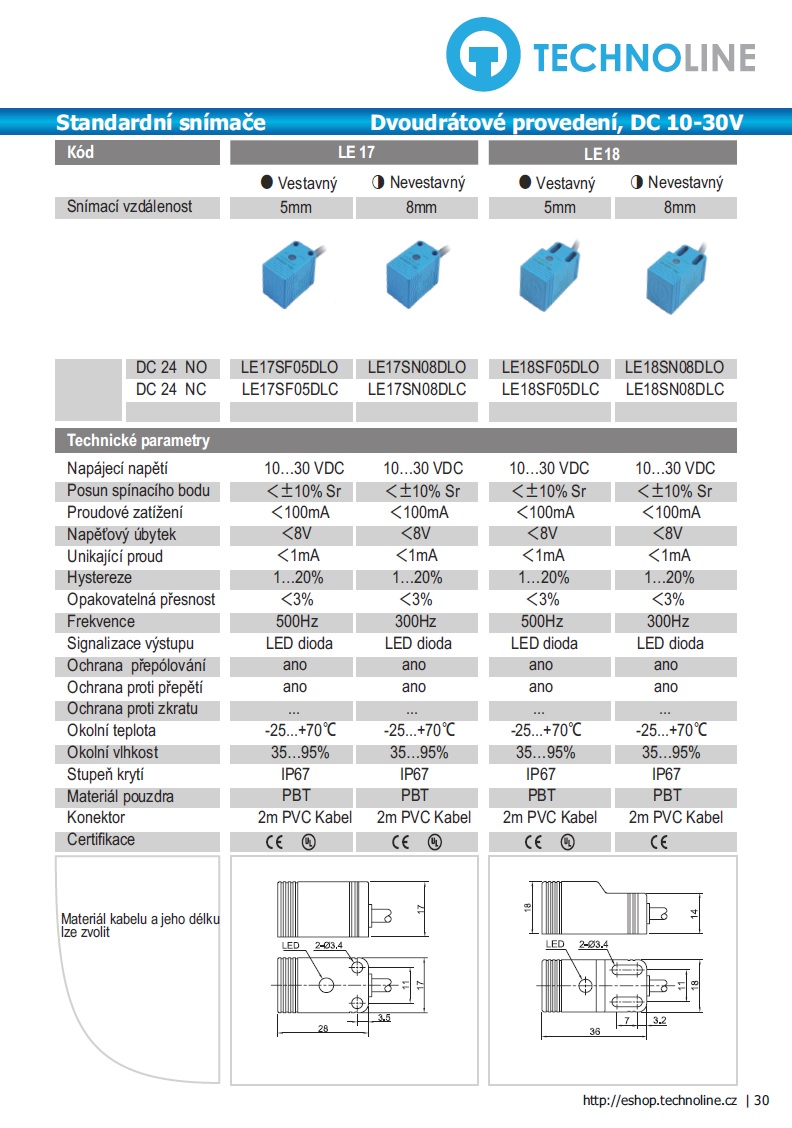 Indukční snímač, 17x17x28mm LE17SF05DLO, 5mm, 2-drát, NO, 10-30VDC, kabel 2m