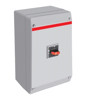 4-pólový odpínač v krytí IP65, plastový, šedý, černá rukojeť uzamykatelná třemi zámky s indikací 0-1 a OFF-ON, N-, PE- svorky