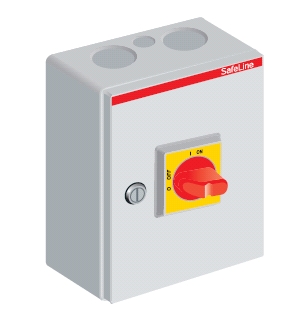 4-pólový odpínač v krytí IP65, ocelový plech, žluto-červená rukojeť uzamykatelná třemi zámky s indikací 0-1 a OFF-ON, N-, PE- svorky